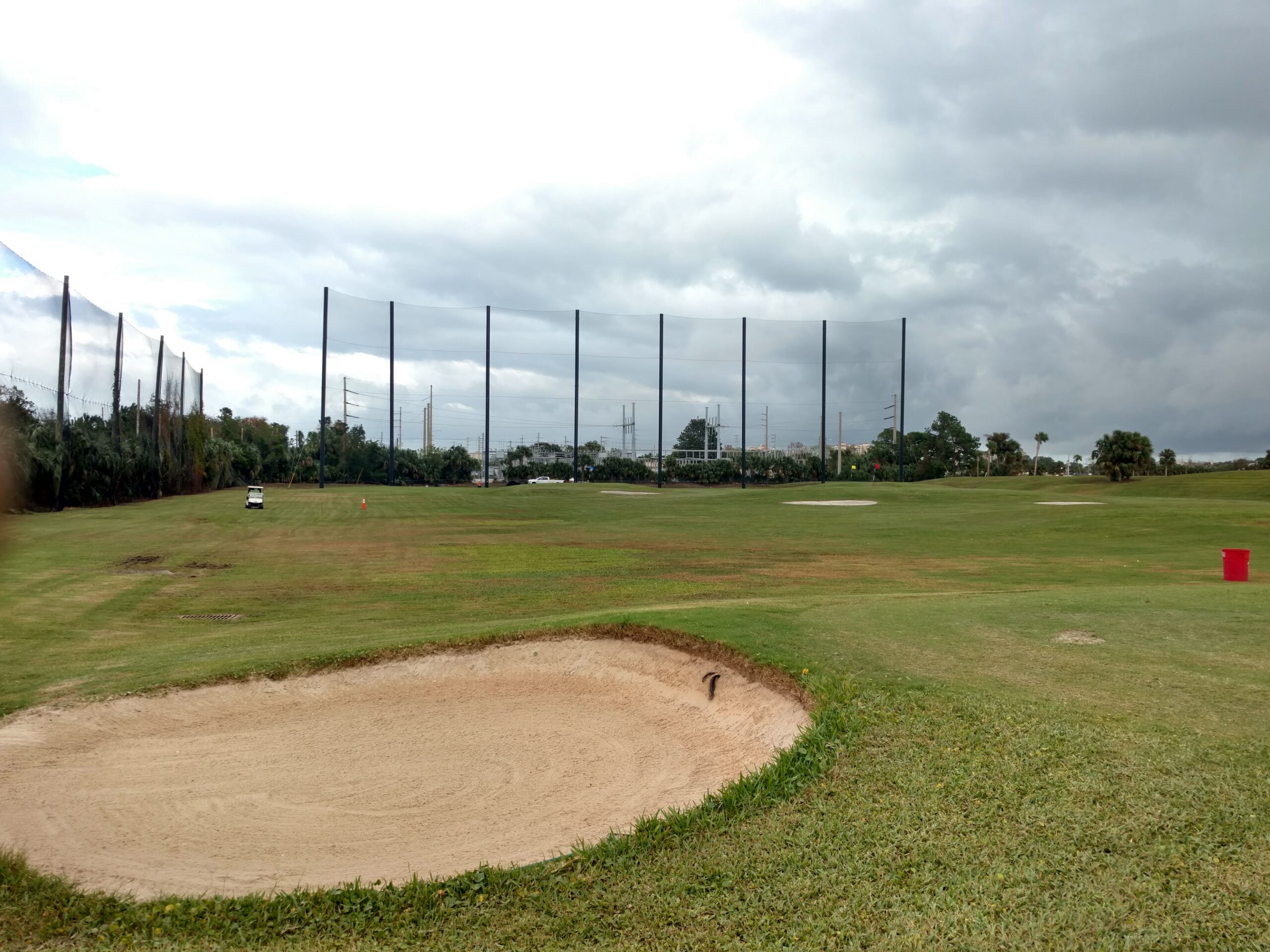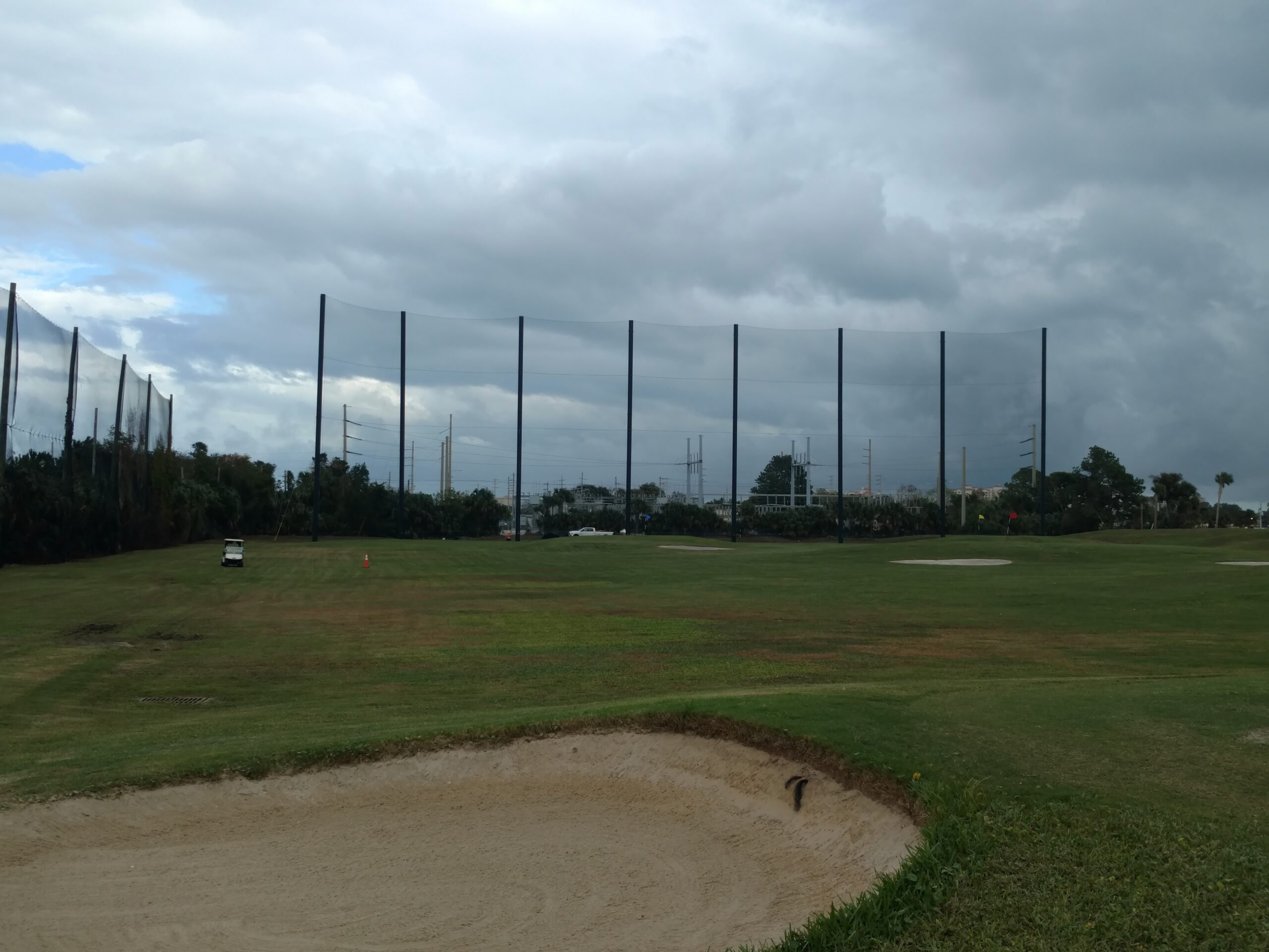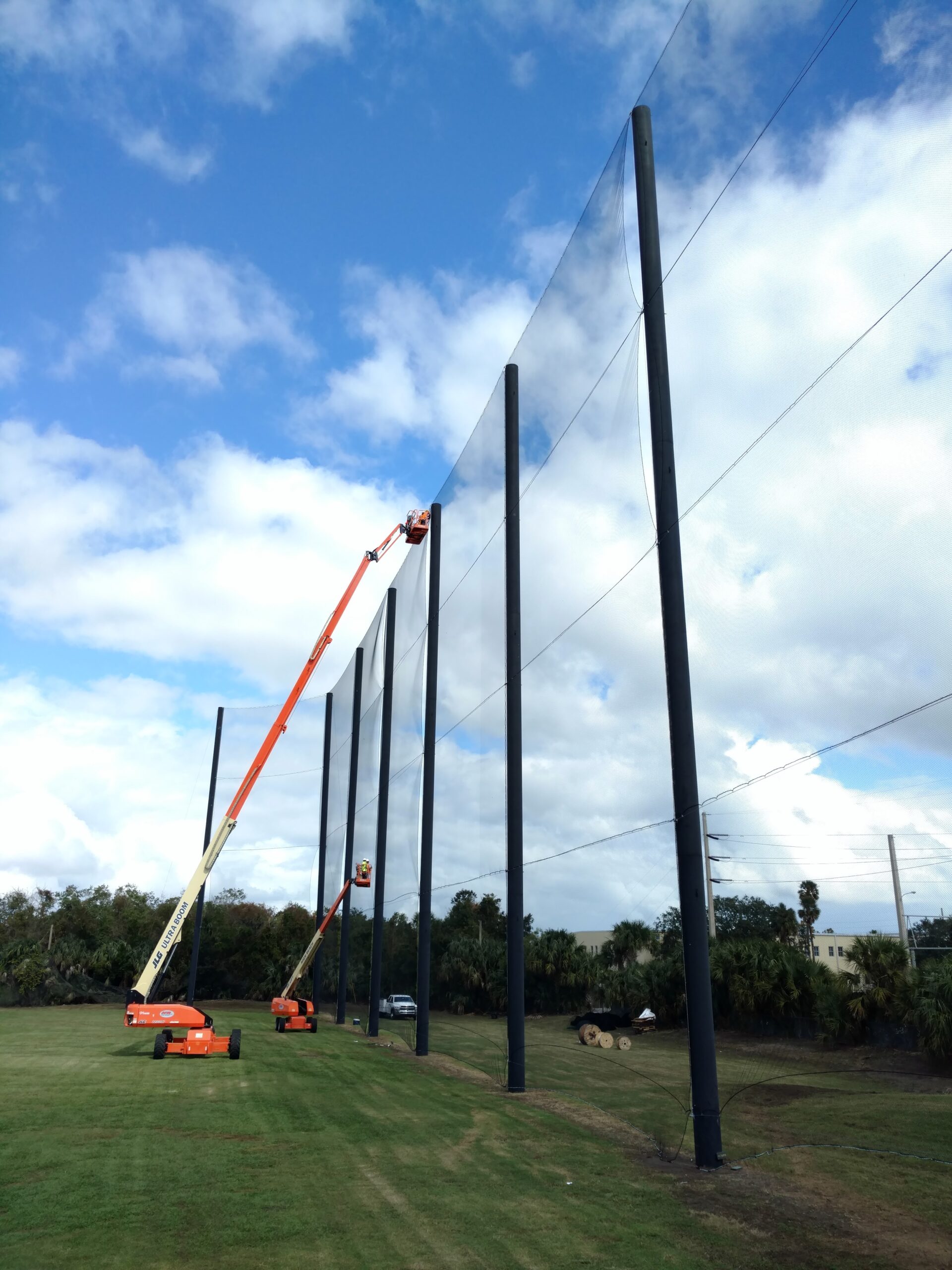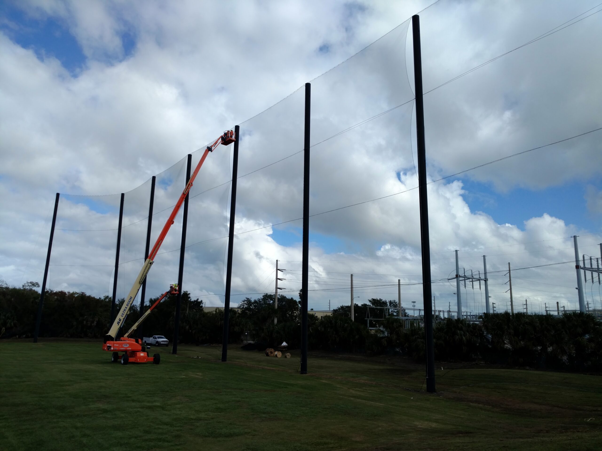 This netting structure provides protection to the utility company adjacent to a golf course.